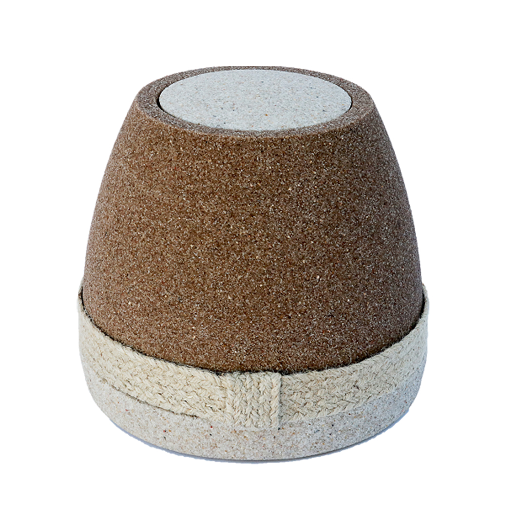 Urna biodegradable feta de sorra de diferents tons. Composició: Sorra clara i fosca, jute i aglutinants vegetals