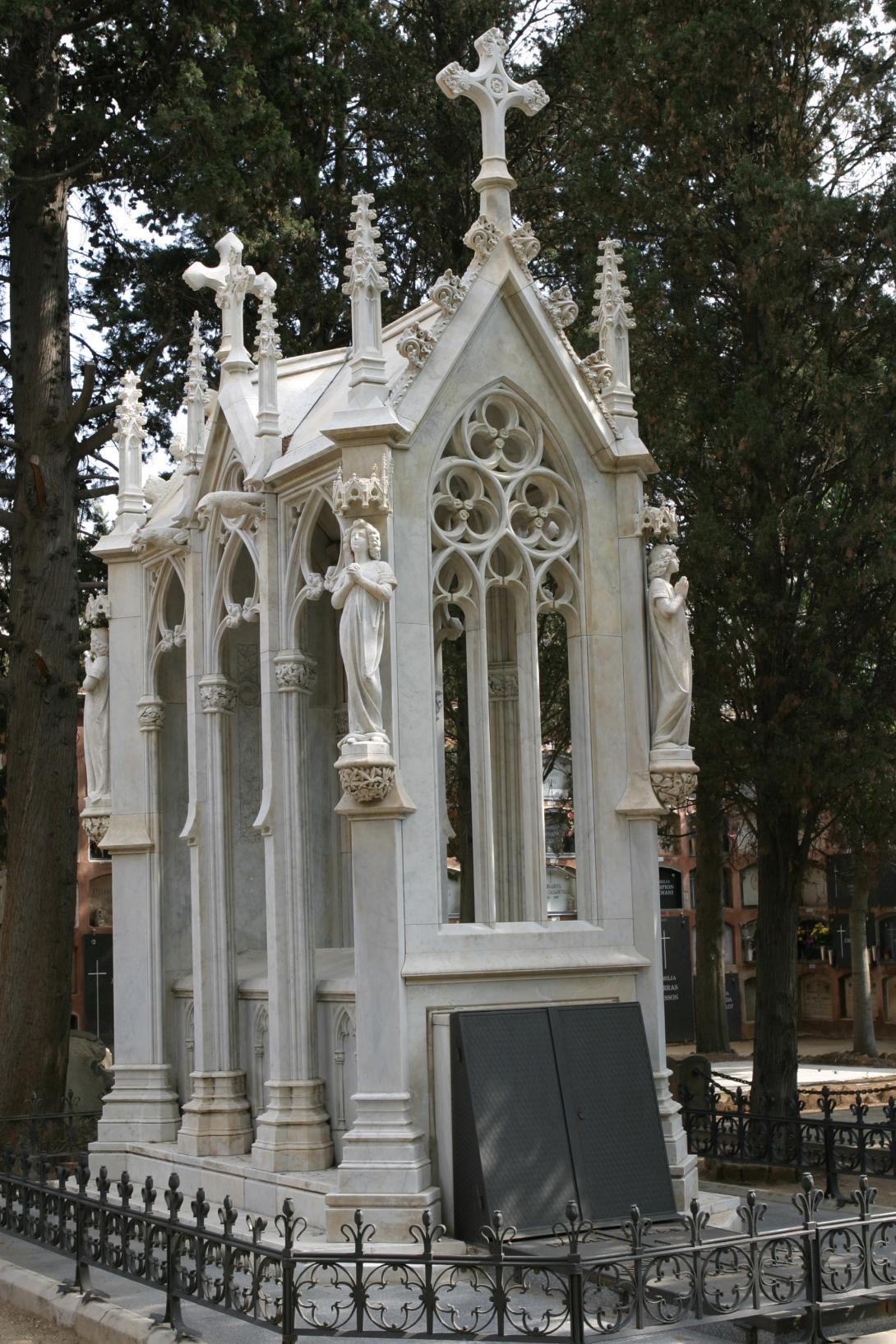 La delicadeza del trabajo de tracería neogótica y los motivos florales (laurel, hiedra, campanillas) conectan con el gusto por los detalles naturalistas propios del Modernismo, un estilo en el que la figura femenina y la naturaleza eran centrales. Este panteón, elevado sobre un pedestal, no solo recuerda a los difuntos, sino que proyecta el poder de una familia que, desde su finca de Can Mestres, controlaba gran parte de la vida social de Vallvidrera y Sarrià.