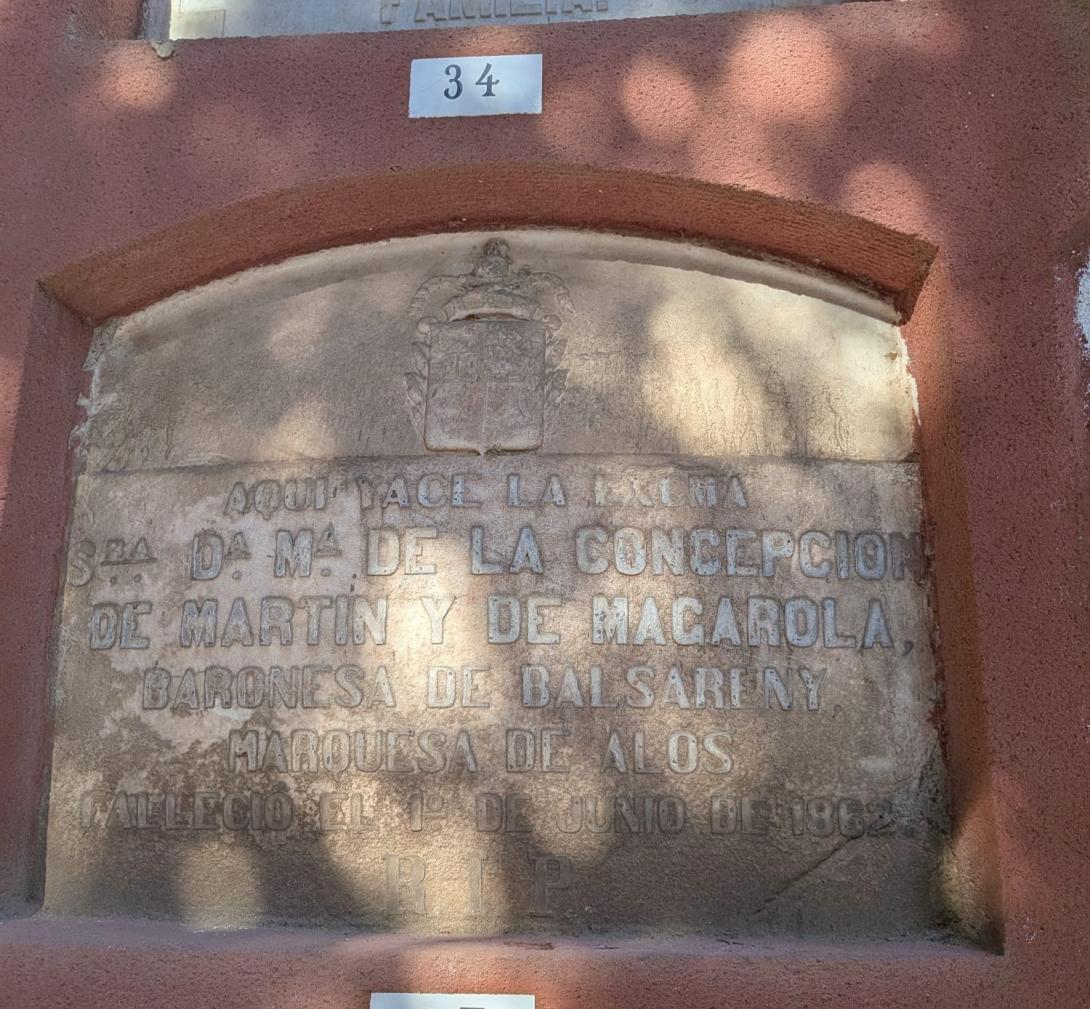 Nos detenemos ahora ante una sepultura que representa la aristocracia más clásica de Sarrià. Aquí descansa María de la Concepción Martín Magarola (1811-1862).