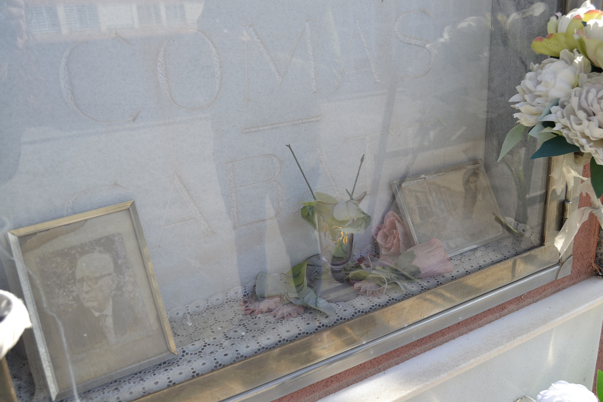 Tornem a trobar-nos amb una sepultura sense interès artístic per la seva simplicitat, però si, històric. Aquí reposa Francesc Comas i Pagès (1896-1923), conegut com “Peronas”, assassinat l’any 1923. Santsenc, va viure al carrer Hartzenbusch 24, a tocar de Can Batlló, i va estar implicat en lluites laborals de l’època. Va participar entre d’altres al Congrés de Sants i va escriure fulletons sota el pseudònim “Peronas” i com molts va patir la repressió.