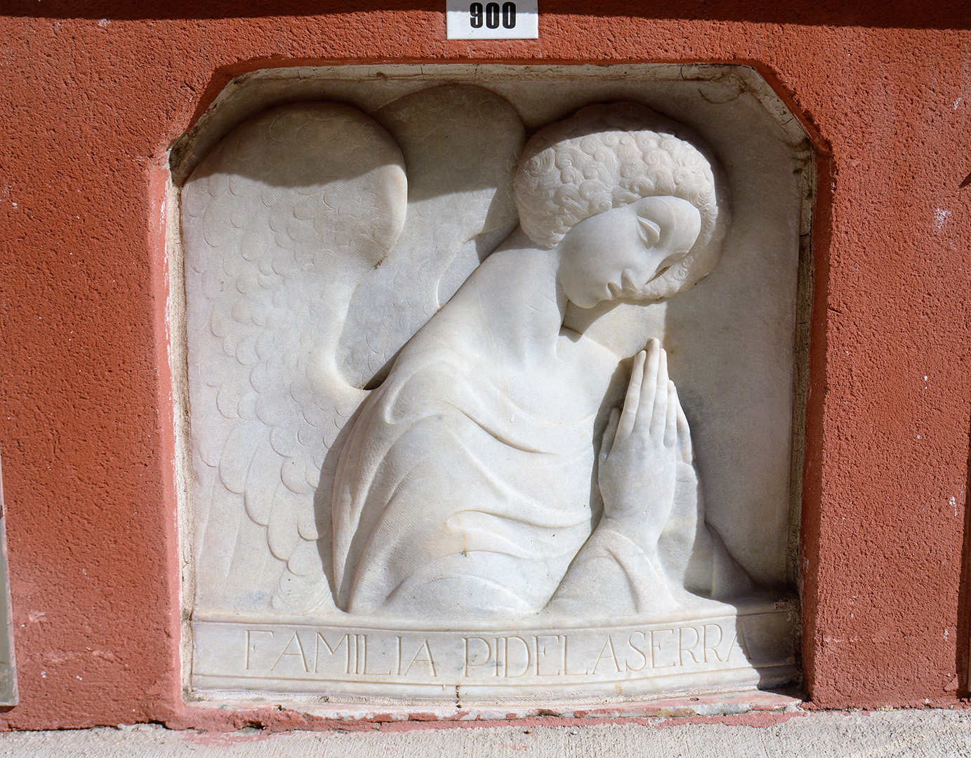 Aquesta làpida de marbre és una de les obres més destacades del Cementiri de Sants. Realitzada per Pau Gargallo i Catalán (1881-1934) és una obra que podem posar en relació amb les versions en bronze posteriors conservades al Museo Pablo Gargallo de Saragossa (núm. inv. 017) o al Museu Nacional d’Art de Catalunya de Barcelona (núm. inv. 202181-000). Aquest Àngel resant ens mostra els camins de l’escultura de Gargallo format en l’àmbit acadèmic amb Venanci Vallmitjana (1830-1919) i al taller modernista d’Eusebi Arnau (1863- 1933).