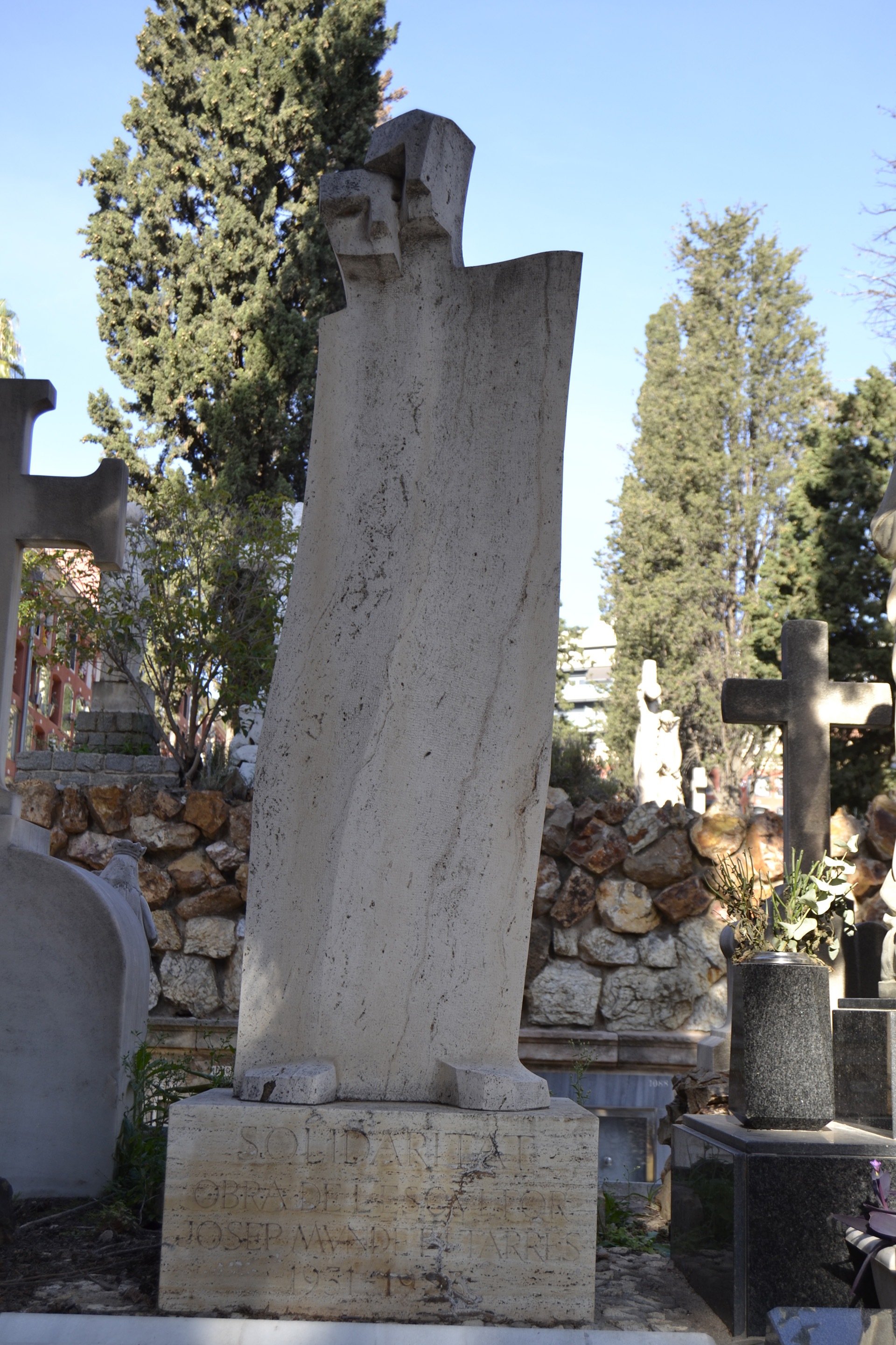 Per la sepultura de la família Salvat ens trobem amb una realització contemporània de l’escultor Josep Mundet i Tarrés (1931-1983) titulada Solidaritat. Un bloc de pedra rectangular és la base per la creació d’una testera fúnebre molt diferent a la resta de peces d’aquest cementiri. Del bloc sobresurten els peus a la part inferior i els dos rostres de la part superior. De línies geomètriques i amb el joc de volums, ens trobem amb una obra que emmarquem amb la producció d’un artista format a l’Escola Superior de les Arts de Barcelona amb mestres com Marés, Monjo, Labarta i Pérez-Dolç. Completà la seva formació a Itàlia i París esdevenint un dels noms de la renovació de les arts plàstiques i antiacadèmiques lluny de les formules clàssiques i governamentals del franquisme. La seva carrera escultòrica engloba retrats, obra religiosa i monuments públics.