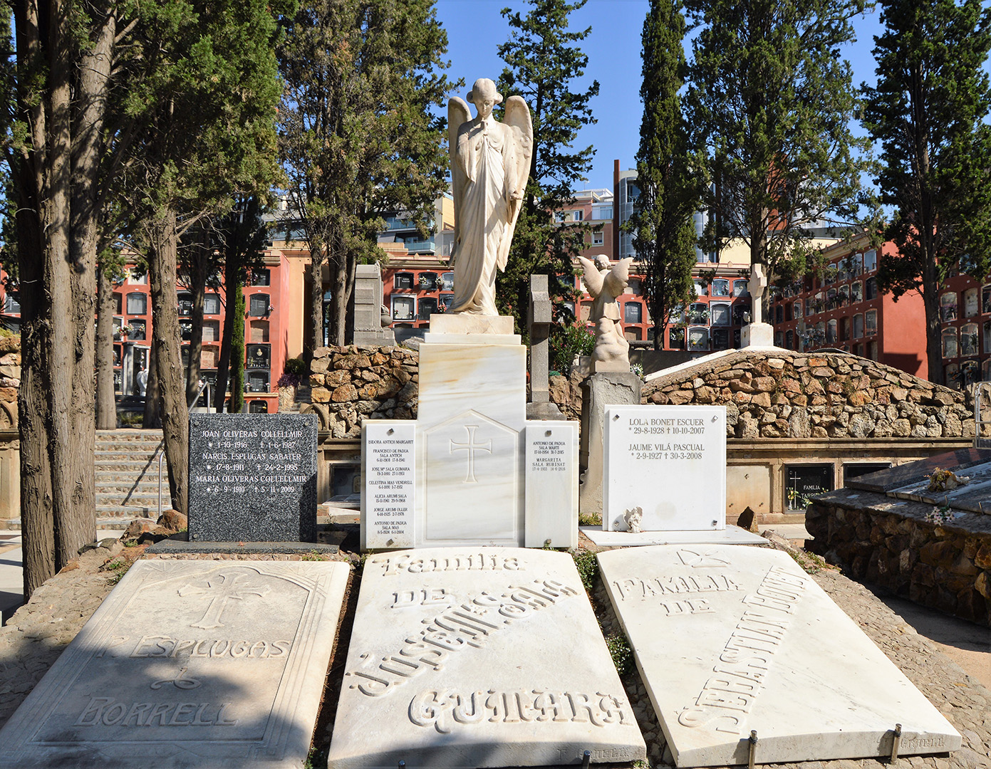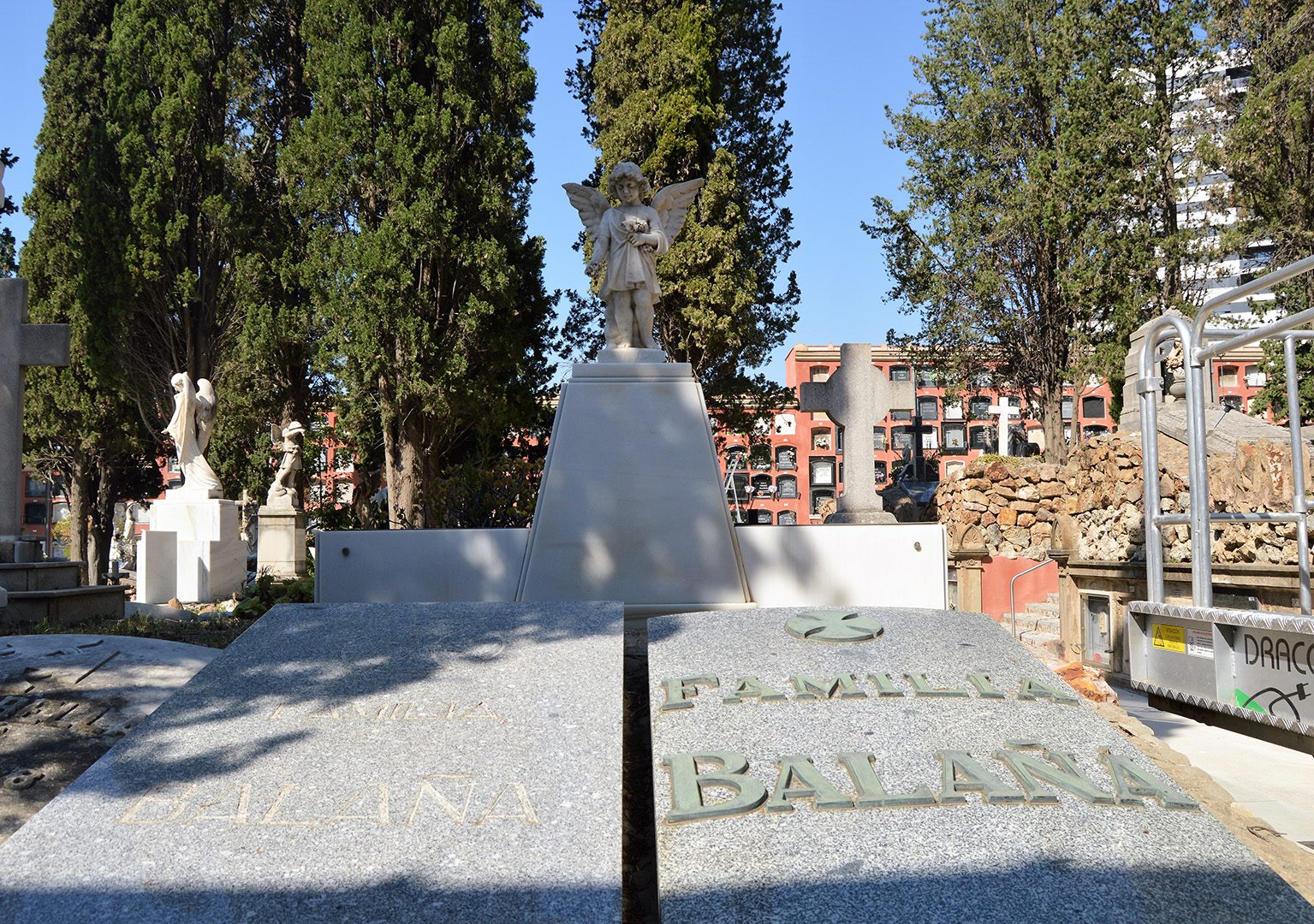 Aquestes dues sepultures de marbre gris pertanyen a la mateixa família, els Balañà. La decoració escultòrica és un infant alat amb flors a la mà esquerra que deixa anar amb la seva dreta sobre la tomba. Per aquesta sepultura, podem observar una gran sobrietat en les solucions artístiques lligada a una de les famílies barcelonines més importants en el món de l’oci. La nissaga comença amb Pere Balañà i Espinós (1883-1965), empresari de cinema i d’espectacles taurins. Va estar vinculat estretament a Sants i fou regidor de l’Ajuntament de Barcelona el 1915 i el 1963, element que explica la selecció del seu lloc de repòs etern. El seu fill, Pere Balañà i Forts (1924-2018), n’heretà els negocis i continuà amb l’expansió de les activitats empresarials familiars en el camp dels cinemes i dels teatres.